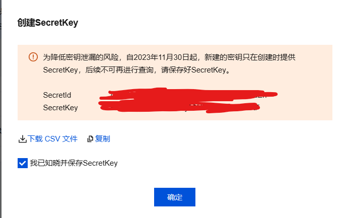 单击新建密钥,将 SecretID 与 SecretKey 复制到1panel中