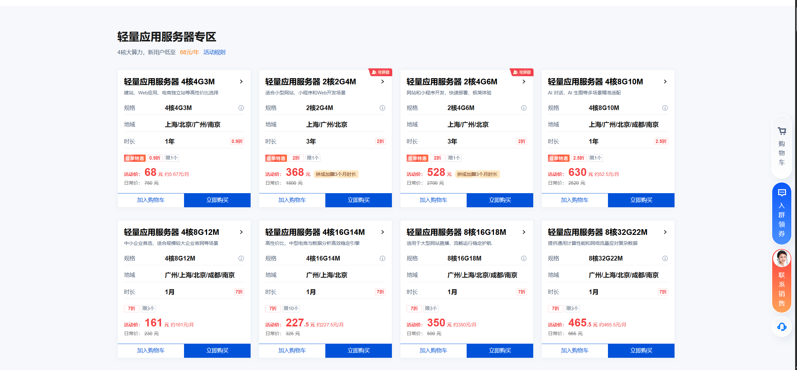 找到新用户优惠专区,选购服务器,推荐上图中第一个4核4G国内服务器