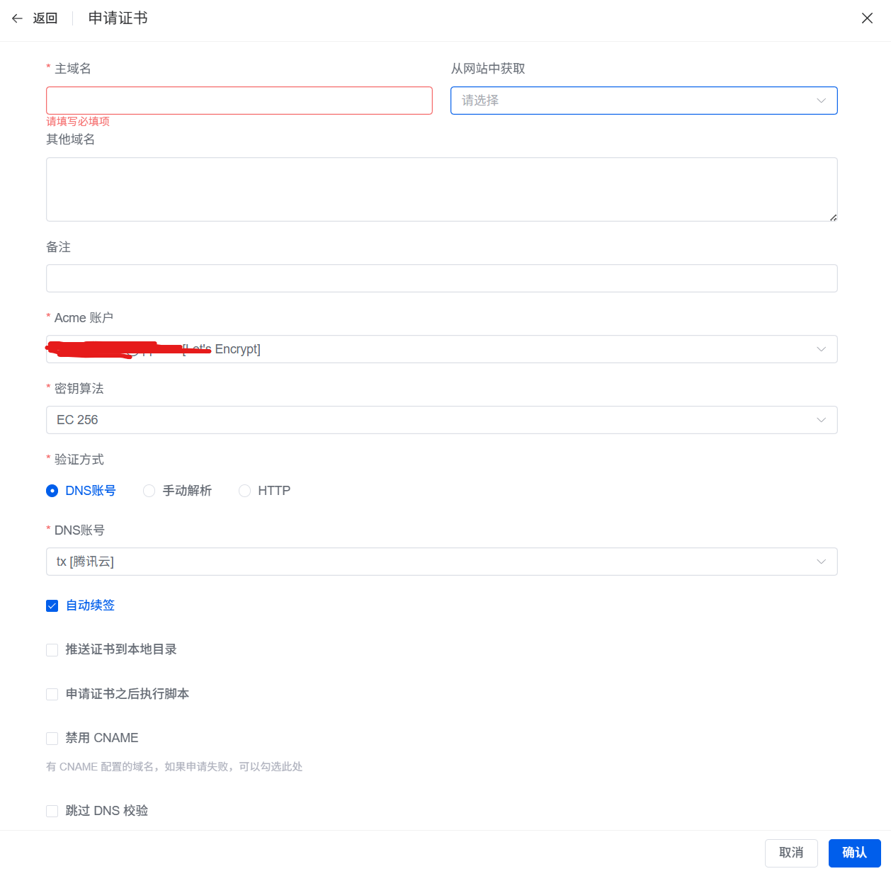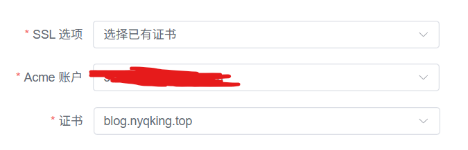 选择你刚刚申请的证书,注意⚠️:1panel可能自带一个Acme账户,不要选错了!!